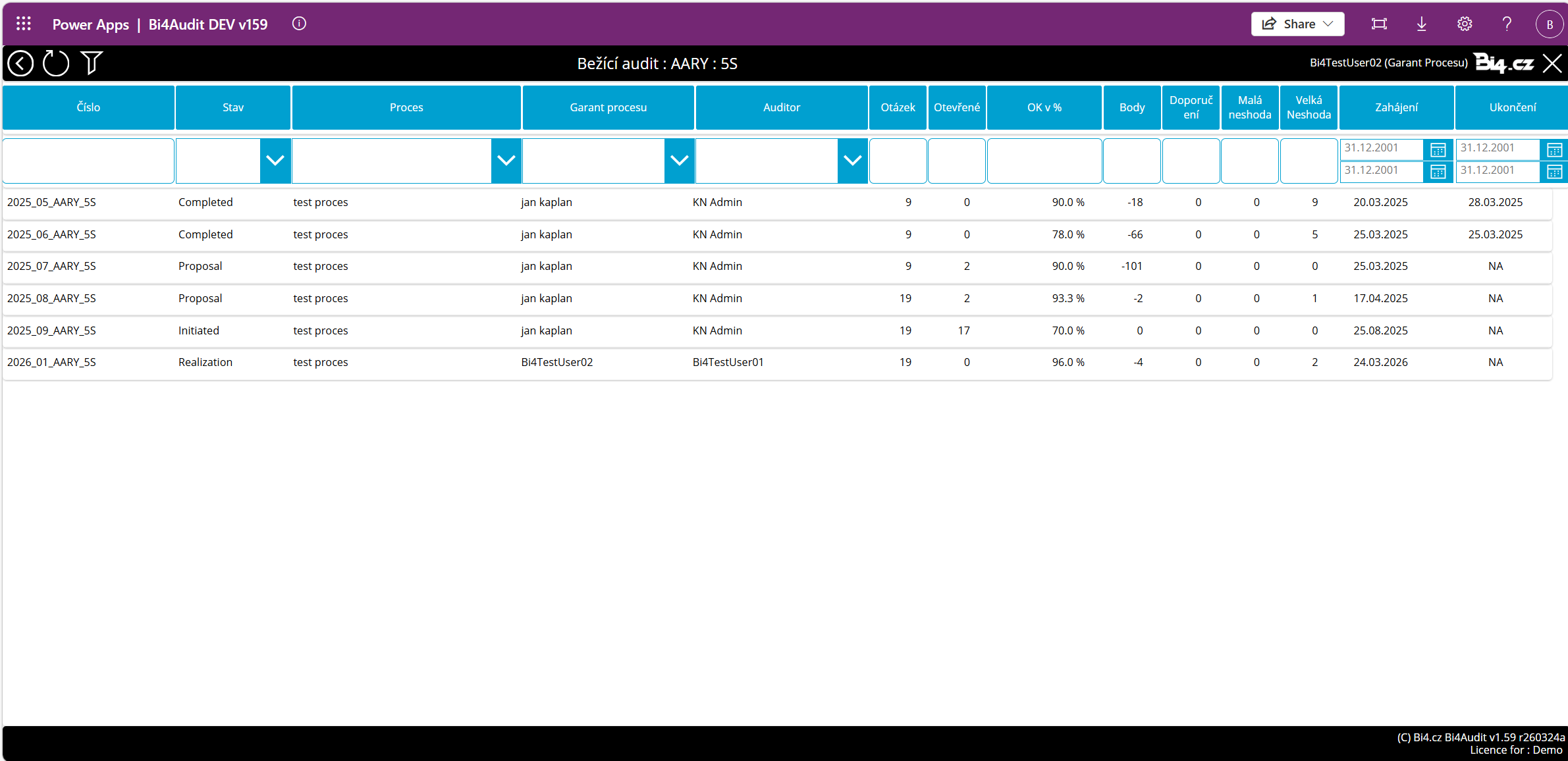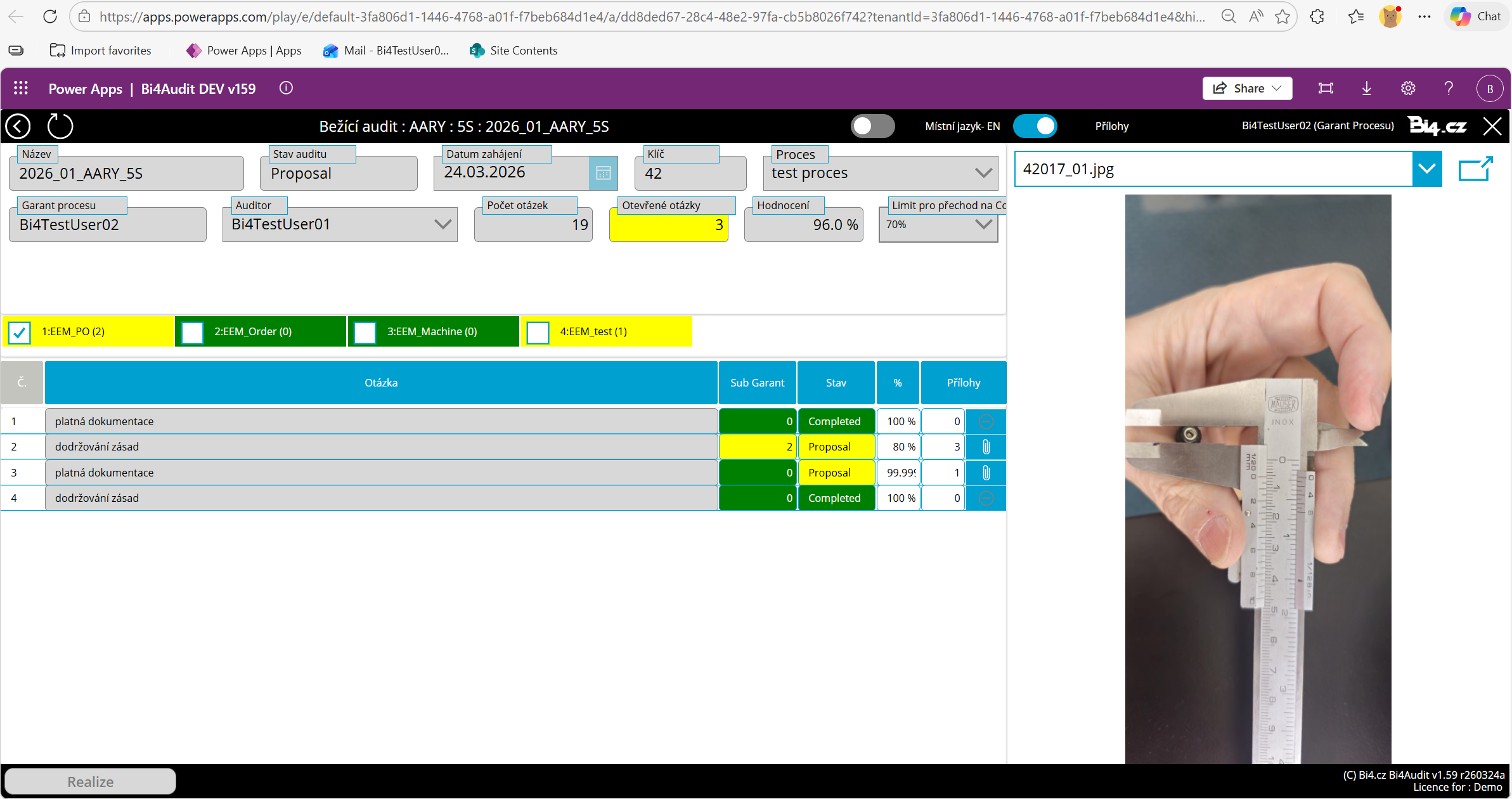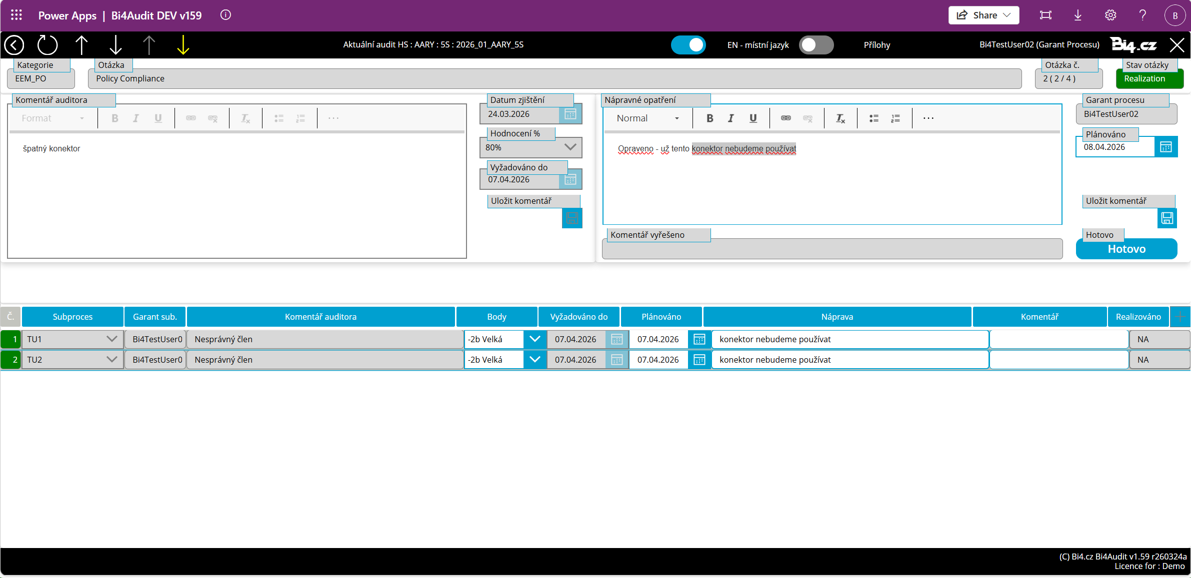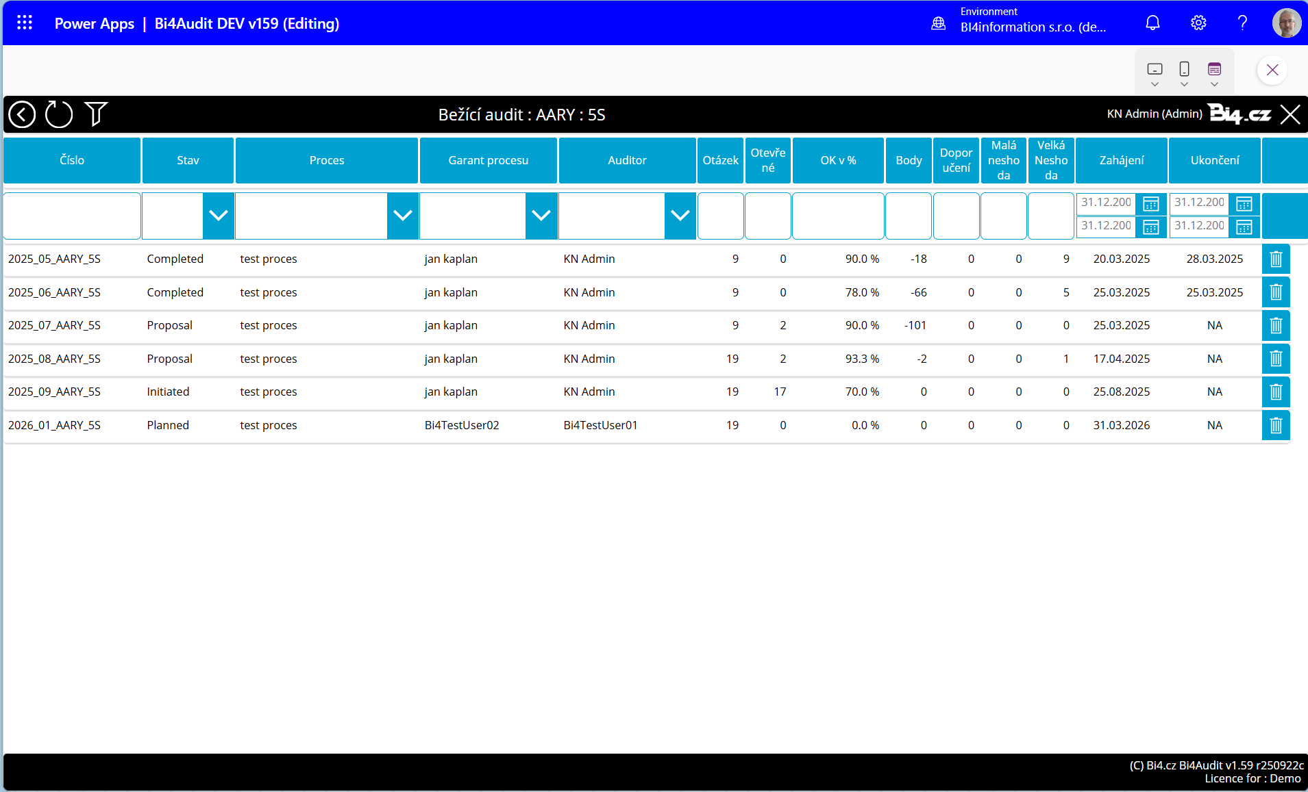Aplikace Bi4 Audit nám dnes umožňuje sledovat výsledky auditů v reálném čase, zobrazovat je ve vizualizacích a filtrovat podle jednotlivých procesů nebo lokalit. Dnes můžeme přesně říct, kdo a kdy se k auditu vyjádřil, co bylo navrženo jako nápravné opatření, a zda bylo skutečně realizováno.