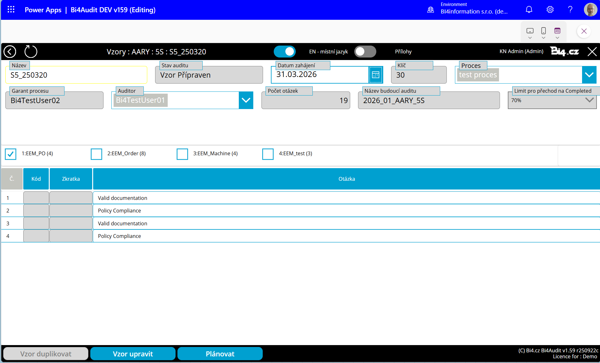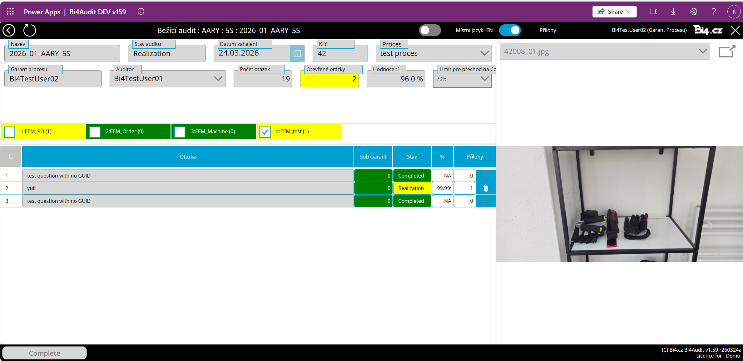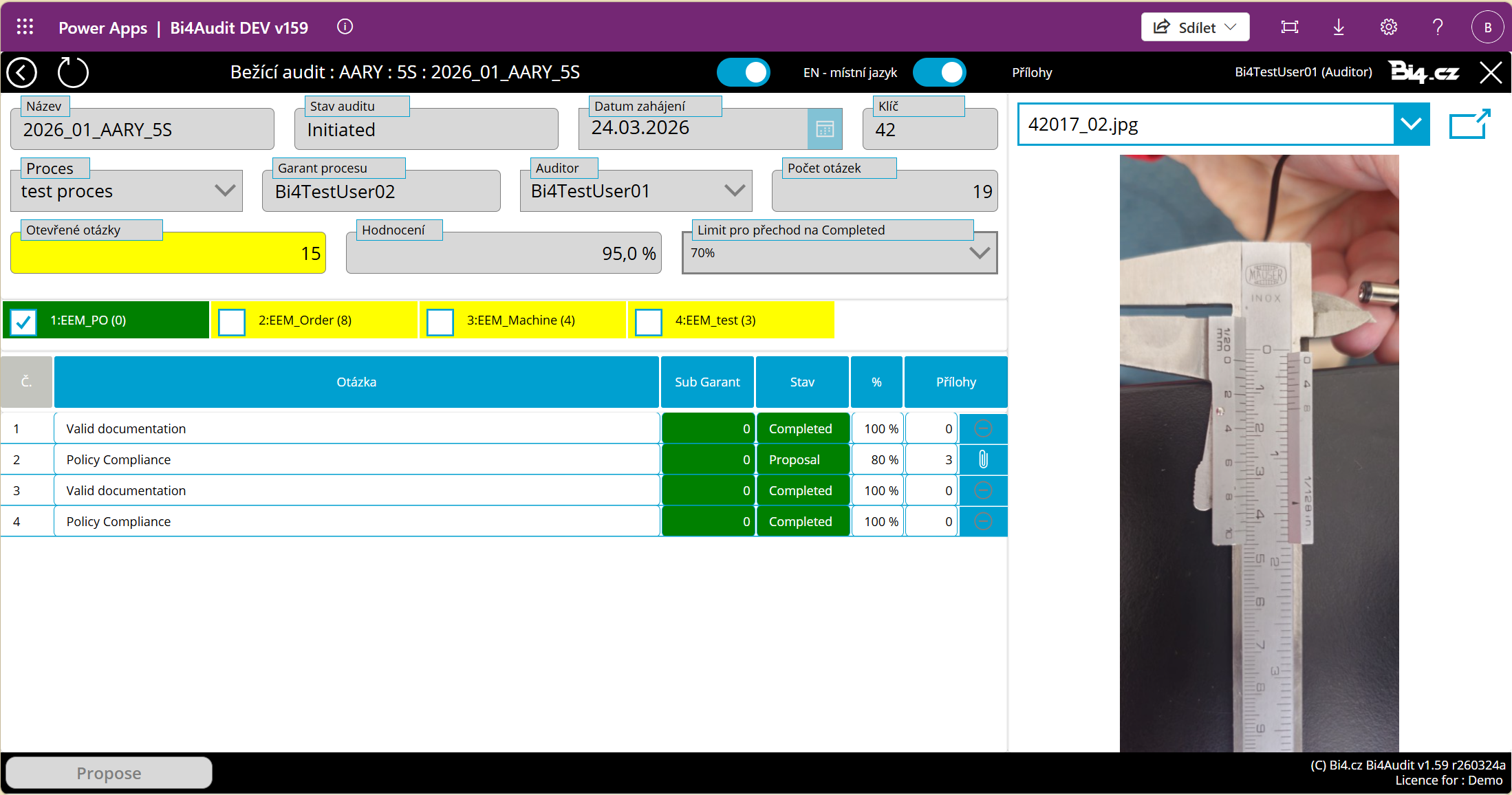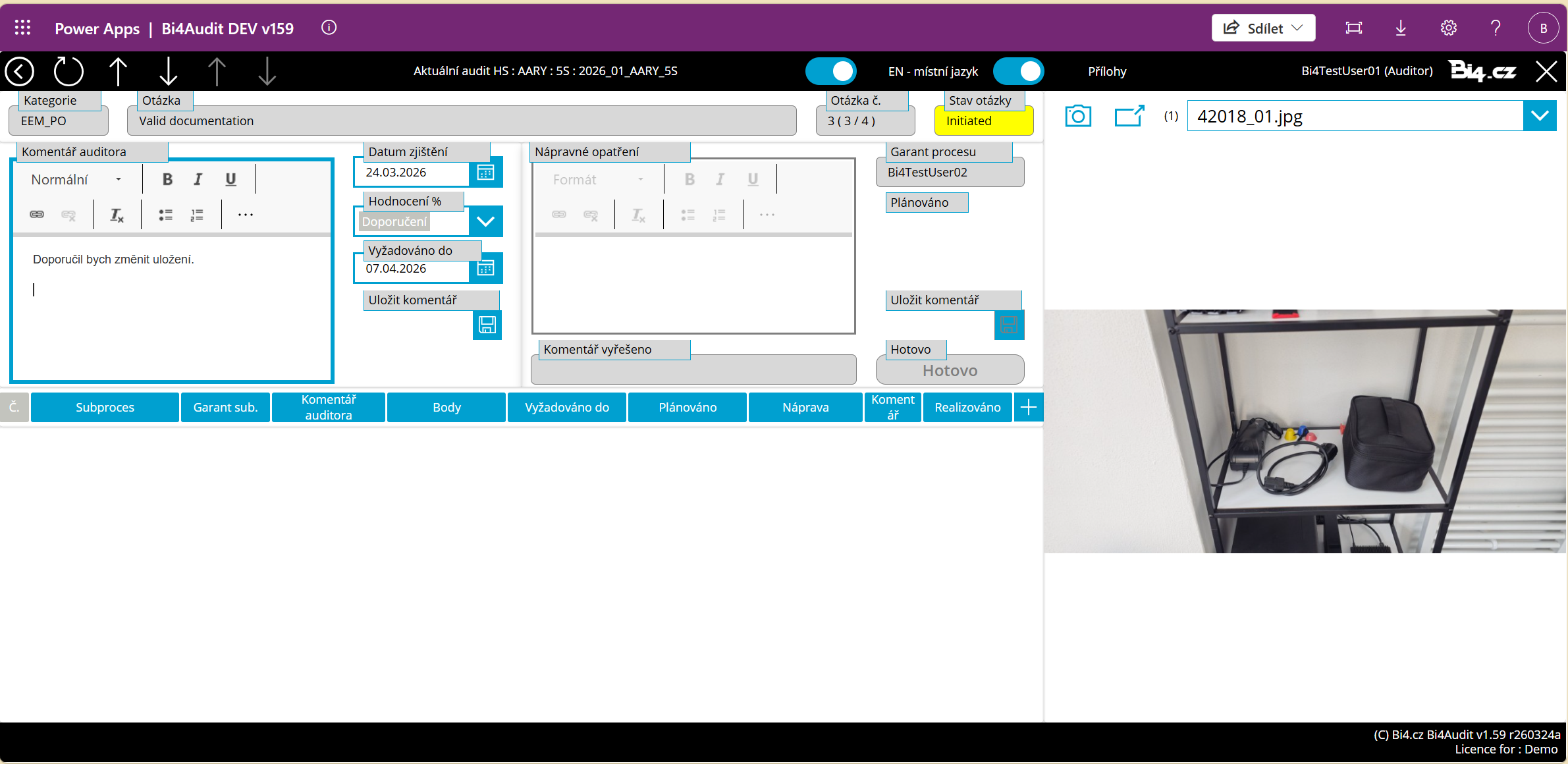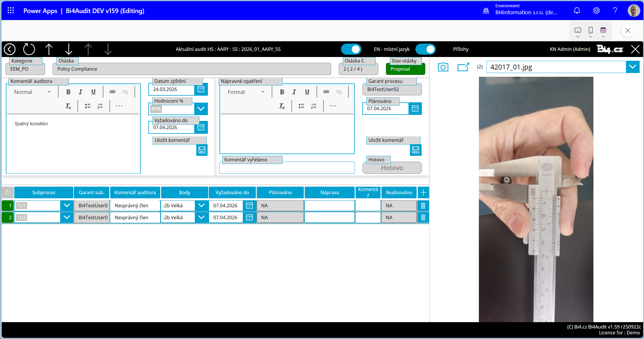 Aplikace Bi4 Audit nám dnes umožňuje sledovat výsledky auditů v reálném čase, zobrazovat je ve vizualizacích a filtrovat podle jednotlivých procesů nebo lokalit. Dnes můžeme přesně říct, kdo a kdy se k auditu vyjádřil, co bylo navrženo jako nápravné opatření, a zda bylo skutečně realizováno.
