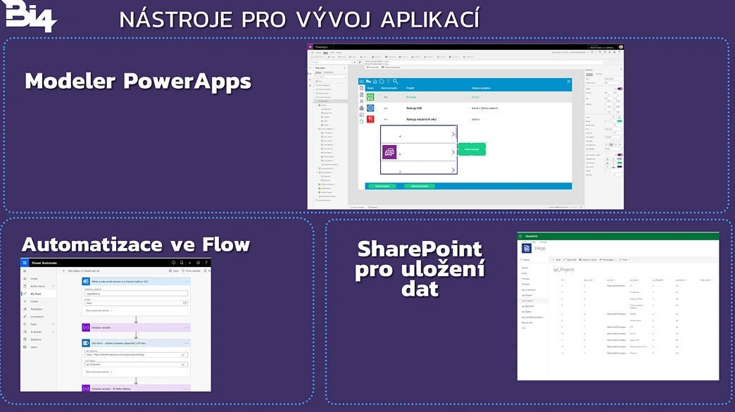 Pro vývoj využíváme modelovacího nástroje, kde začínáme návrhem uživatelského prostředí, tak jak bude vidět ve výsledném produktu. Je tak možné řešit problémy pomocí vizuálních nástrojů bez znalosti složitých programovacích jazyků. Jako úložiště dat využíváme především SharePoint Online, kde jsou data bezpečně uložena s přístupem pouze pro osoby s právem přístupu k aplikaci. Je tak možné jednoduše zaznamenávat změny, které uživatel na jednotlivých položkách dělá. Pro automatizaci procesů je využit Power Automate. Místo psaní složitých kódů, je možné procesy a toky modelovat pomocí metody ukázat a kliknout. Díky více než 200 konektorům je možné se připojit téměř k jakémukoliv zdroji dat. Více informací na o této technologii je na https://powerapps.microsoft.com/en-us/
